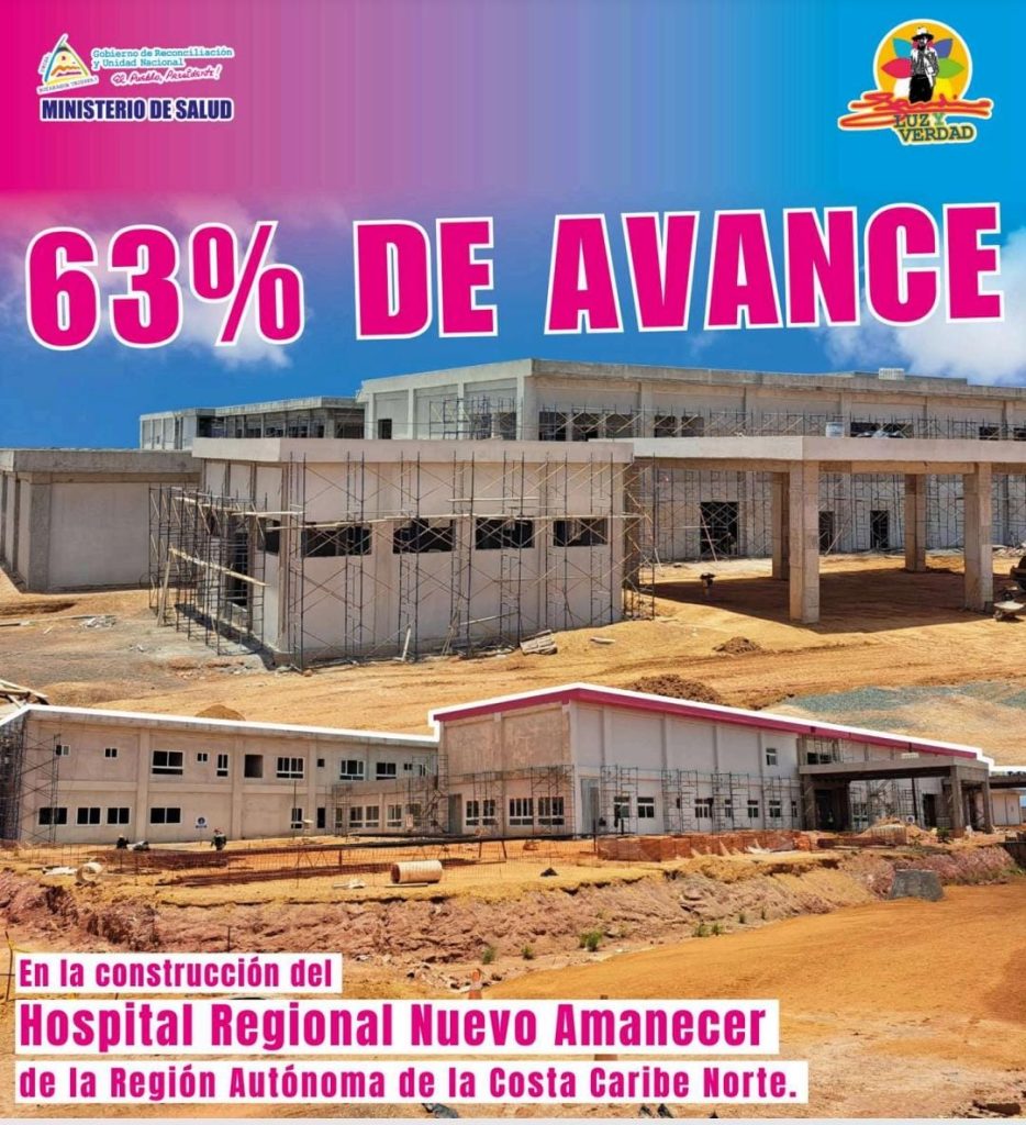 Actualmente, se construye el Hospital Regional “Nuevo Amanecer” de la Región Autónoma de la Costa Caribe Norte, que permitirá atender a más de 242,145 personas de esa Región, quienes en su mayoría pertenecen a los Pueblos Mayagnas y Miskitus.
