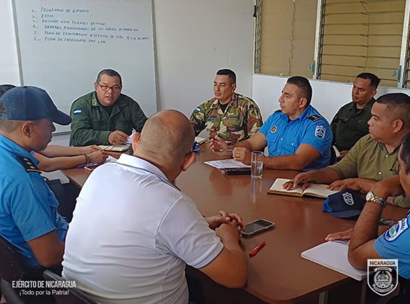 El Ejército de Nicaragua consecuente con el lema de que “Somos el Pueblo mismo uniformado trabajando en su propio beneficio”, el 9 de mayo de 2024, a través del jefe del Estado Mayor del 4 Comando Militar Regional, Teniente Coronel Inf. DEM Aldo Martín Mendieta, en coordinación con instituciones del Estado, participó en reunión interinstitucional, con el objetivo de fortalecer los procedimientos de trabajo para la protección y seguridad de la frontera estatal en aspectos como: migración ilegal, seguridad ciudadana, seguridad en el campo, trata de personas, salud animal, sanidad vegetal, protección fitosanitaria y la lucha contra el contrabando.
