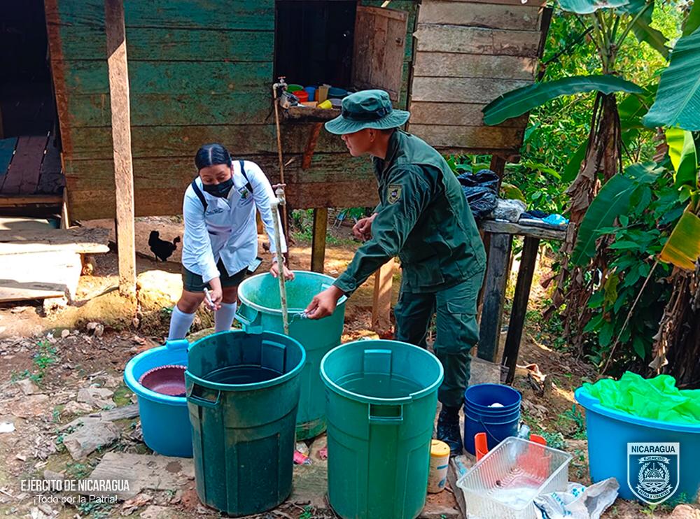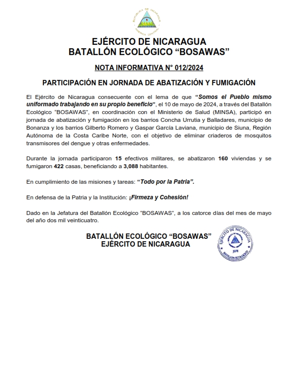 El Ejército de Nicaragua consecuente con el lema de que “Somos el Pueblo mismo uniformado trabajando en su propio beneficio”, el 10 de mayo de 2024, a través del Batallón Ecológico “BOSAWAS”, en coordinación con el Ministerio de Salud (MINSA), participó en jornada de abatización y fumigación en los barrios Concha Urrutia y Balladares, municipio de Bonanza y los barrios Gilberto Romero y Gaspar García Laviana, municipio de Siuna, Región Autónoma de la Costa Caribe Norte, con el objetivo de eliminar criaderos de mosquitos transmisores del dengue y otras enfermedades.