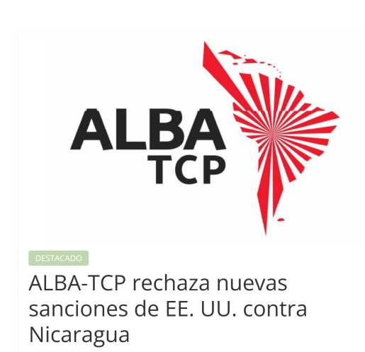 La Alianza Bolivariana para los Pueblos de Nuestra América-Tratado de Comercio de los Pueblos (ALBA-TCP), manifestó su firme rechazo a las nuevas sanciones impuestas por el gobierno estadounidense a entidades y ciudadanos de Nicaragua.