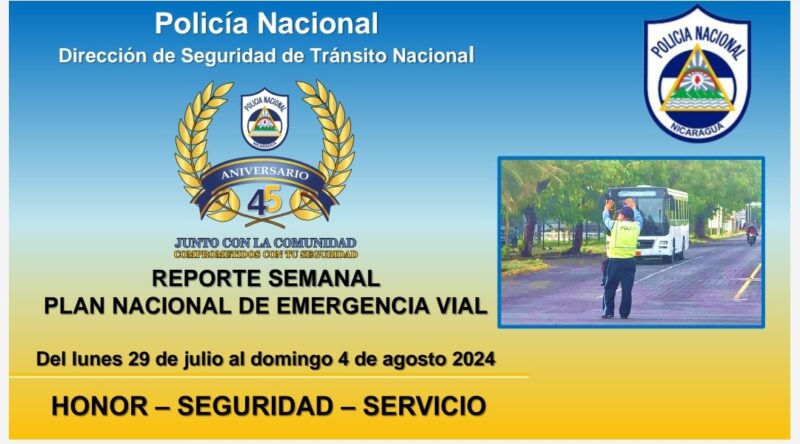 La Dirección General de Tránsito Nacional de la Policía Nacional, presentó su informe semanal sobre el Plan Nacional de Emergencia Vial, destacando las acciones implementadas del 29 de julio al 4 de agosto de 2024.