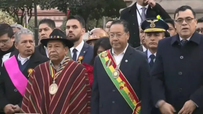 Pasadas las 07H15 horas el presidente del Estado, Luis Arce, llegó a la plaza 25 de Mayo, junto con el vicepresidente David Choquehuanca,y el presidente de la Cámara de Diputados, Israel Haytari, donde recibió los honores a su investidura.