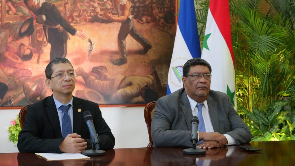 Los Compañeros Iván Lara y Valdrack Jaentschke, transmitieron los saludos siempre Solidarios, Fraternos y Revolucionarios, del Presidente Comandante Daniel Ortega Saavedra y de la Vicepresidenta Compañera Rosario Murillo, al Hermano Pueblo y Gobierno de Siria. Reiteraron también el invariable compromiso de continuar fortaleciendo los Lazos Históricos de Hermandad y Solidaridad entre nuestros Pueblos y Gobiernos; y transmitieron la más enérgica condena a toda forma de agresión de los colonialistas y neocolonialistas, que atentan contra la Soberanía y la Libre Determinación de los Pueblos, en clara y flagrante violación del Derecho Internacional.