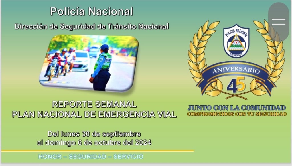 La Dirección General de Tránsito Nacional de la Policía Nacional, presentó su informe semanal sobre el Plan Nacional de Emergencia Vial, destacando las acciones implementadas del lunes 30 de septiembre al domingo 6 de octubre de 2024.