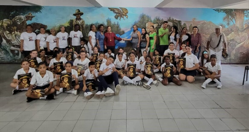 Como un símbolo de la Amistad y Solidaridad entre ambos Pueblos, nuestra Embajadora, Compañera Guisell Morales Echaverry, con el mural de Sandino de fondo, junto a estudiantes, comunidad educativa y representantes del Ministerio de Educación Cubano, del Partido Comunista y Juventud Comunista del Municipio, con poemas, canciones y danzas, honraron la entrañable pre-sencia y ejemplo inmortal antimperialista de nuestro Héroe Nacional, compartiendo entrelazados los Corazones de Cuba y Nicaragua entera, nuestro Octubre Victorioso y el inicio de la jornada que va hasta el 28 de Octubre, de remembranza del Guerrillero Heroico, Ché Guevara” y el Señor de la Vanguardia, Camilo Cienfuegos, dos hijos de América, que hermanados por la Libertad de Cuba Socialista, la tierra de sus amores, siguiendo la luz y el fuego de los faros gigantes antimperialistas, de El Libertador, Bolívar, del Apóstol, Martí y del General de los Hombres y Mujeres Libres, Sandino, como llamarada inextinguible, inspiran y forjan nuestro futuro de Paz y Soberanía.