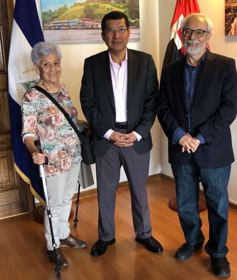 Con el objetivo de estrechar lazos fraternales, visitaron el día de hoy, la Embajada de Nicaragua en Chile, el Compañero Jaime Lorca Tobar, Director del Centro de Formación, Memoria y Futuro y la Compañera Celsa Parrau, integrante del mismo Centro. El Compañero Jaime Lorca, es un reconocido luchador y activista social y, la Compañera Celsa Parrau, una brigadista, internacionalista que ha visitado nuestro País.