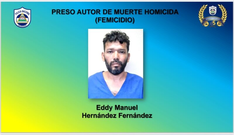 La Policía Nacional de Nicaragua informó sobre la captura de Eddy Manuel Hernández Fernández, acusado del feminicidio de Cynthia Carolina Gómez Mejía, ocurrido en el municipio de Tipitapa el 21 de octubre del 2024.