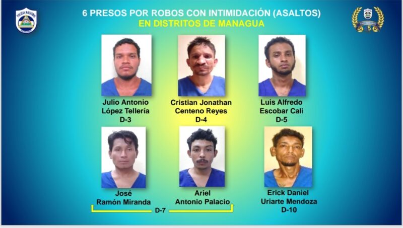En el informe también se mencionó que 8 sujetos fueron capturados por asaltos en varios distritos de Managua. Se recuperaron como evidencias: una motocicleta, piezas de motocicleta, tres cascos y cinco teléfonos celulares.