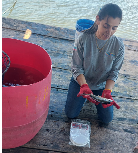 Doña Juana Aguilera de la Comunidad de Aserradores logró recolectar en esta cosecha un total de 7,851 pescados cultivados en 2 jaulas flotantes, equivalentes a 5,934 libras.