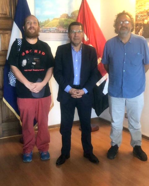 La Embajada de Nicaragua en Chile, recibió, hoy, 9 de Enero, la visita de Iván Carrasco, Presidente del Partido Igualdad. Lo acompañó el Compañero Fernando Martínez, Militante y Activista del Partido. La visita tenía el objetivo de estrechar Lazos de Solidaridad internacionalista con nuestra Nicaragua.