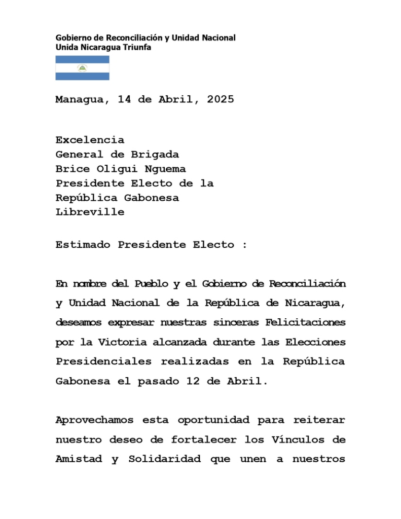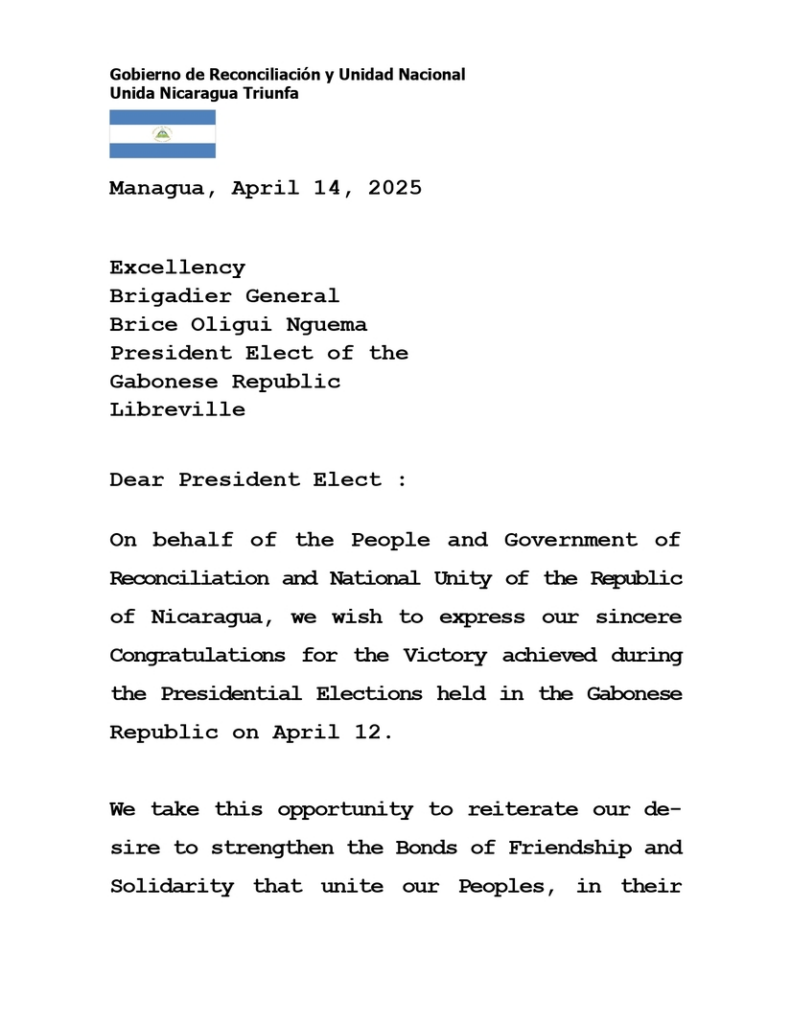 En un mensaje oficial fechado el 14 de abril de 2025, el Gobierno de Reconciliación y Unidad Nacional de la República de Nicaragua, en nombre del pueblo nicaragüense, felicitó al General de Brigada Brice Oligui Nguema por su elección como Presidente de la República Gabonesa. En la misiva, Nicaragua expresó su compromiso de continuar fortaleciendo los lazos de amistad, solidaridad y cooperación entre ambas naciones, con el firme propósito de avanzar en la construcción de un mundo más justo, equitativo y en paz.