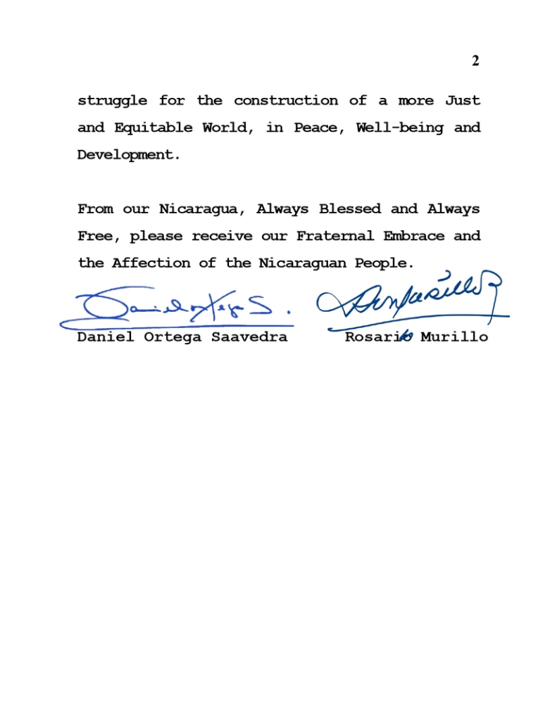 From our Nicaragua, Always Blessed and Always Free, please receive our Fraternal Embrace and the Affection of the Nicaraguan People.