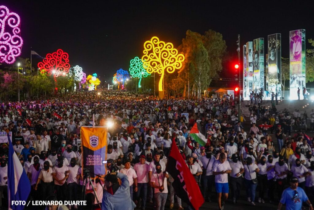 Al ritmo de filarmónicas, bandas rítmicas y canciones revolucionarias, el pueblo sandinista avanzó por las principales avenidas de Managua ondeando con orgullo las banderas rojinegra y azul, blanco y azul, en una expresión vibrante de amor a la patria, a la Revolución y a la tranquilidad conquistada.