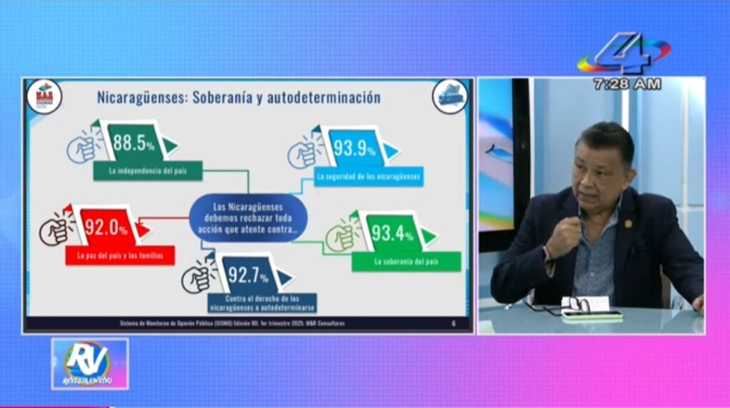 El diputado Wilfredo Navarro Moreira analizó este lunes en la Revista En Vivo de Canal 4 los resultados del más reciente estudio de M&R Consultores, destacando la importancia de la paz, la estabilidad económica y el compromiso de los nicaragüenses con el desarrollo del país.