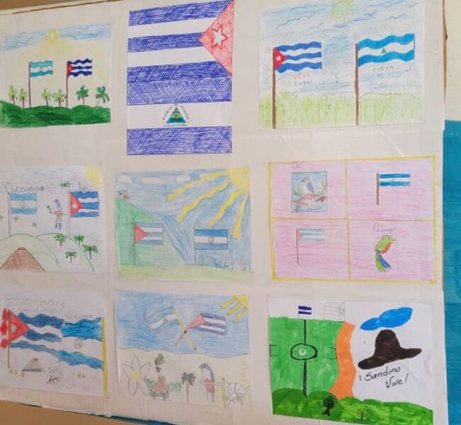 Asimismo, los Estudiantes de la Escuela elaboraron un mural de bienvenida y dibujaron nuestros volcanes y nuestra Flor de Sacuanjoche, como una muestra de la Amistad, Cariño y Solidaridad entre los Pueblos de Nicaragua y Cuba.