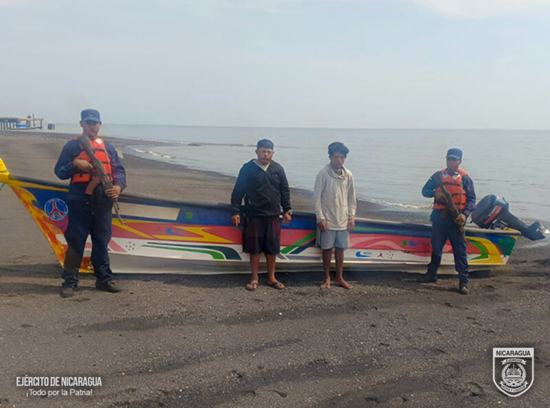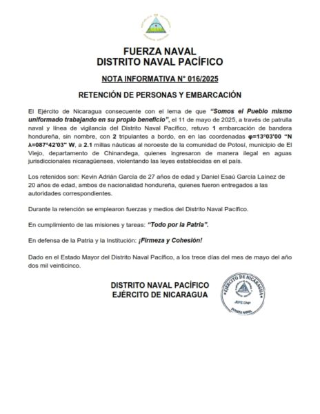 El Ejército de Nicaragua consecuente con el lema de que “Somos el Pueblo mismo uniformado trabajando en su propio beneficio”, el 11 de mayo de 2025, a través de patrulla naval y línea de vigilancia del Distrito Naval Pacífico, retuvo 1 embarcación de bandera hondureña, sin nombre, con 2 tripulantes a bordo, en en las coordenadas φ=13°03’00 “N λ=087°42’03» W,a 2.1 millas náuticasal noroeste de la comunidad de Potosí, municipio de El Viejo, departamento de Chinandega, quienes ingresaron de manera ilegal en aguas jurisdiccionales nicaragüenses, violentando las leyes establecidas en el país.