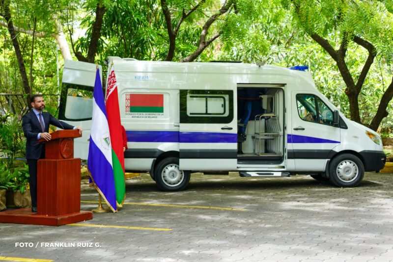 La ambulancia fue entregada simbólicamente por Alexander Egorov, representante especial del presidente Lukashenko para los asuntos con Nicaragua, quien destacó la importancia de elevar el nivel de vida del pueblo nicaragüense mediante la cooperación en salud y educación.