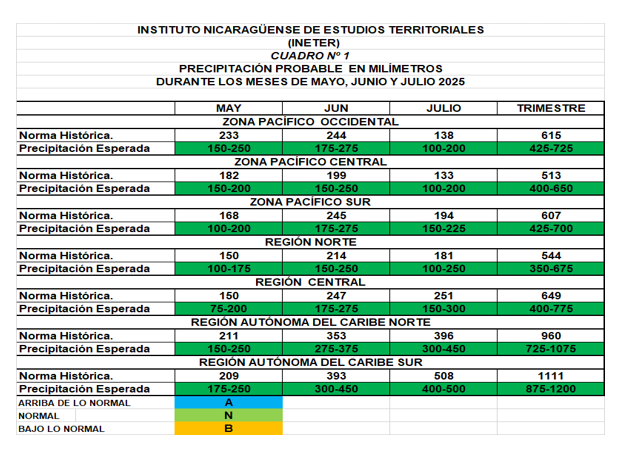 Según análisis realizados de las condiciones océano-atmosféricas y a los registros de lluvia en años análogos al 2025; para el territorio nacional, se prevé el siguiente comportamiento: