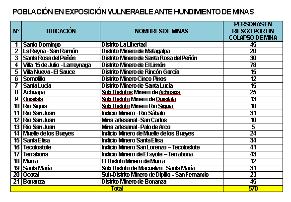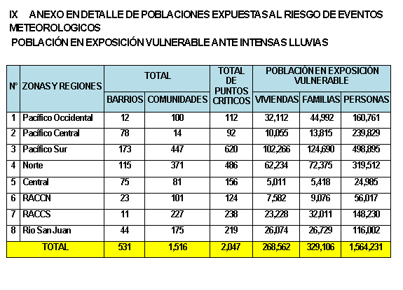 Las poblaciones mayormente expuestas a inundaciones se encuentran en las dos regiones del Caribe incluyendo el Triángulo Minero y los departamentos de Río San Juan, Jinotega, Matagalpa, Zelaya Central, Nueva Guinea, Chinandega, Rivas, Granada y Managua.
