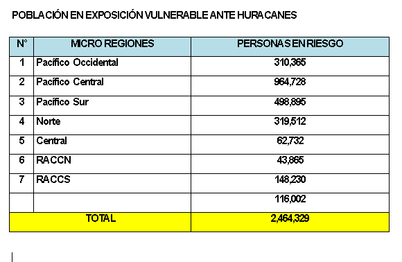 Las poblaciones mayormente expuestas a huracanes se encuentran en las dos regiones del Caribe incluyendo el Triángulo Minero y los departamentos de Río San Juan, Jinotega, Nueva Segovia, Chinandega y Rivas.