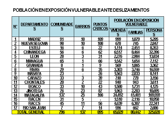 Las poblaciones mayormente expuestas a deslizamientos en los departamentos de Jinotega, Matagalpa, Nueva Segovia, Madriz, Boaco, Chontales, Chinandega, Rivas, Granada y Managua.