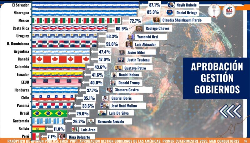 En el renglón de aprobación de la gestión de gobierno, Nicaragua ocupa el segundo lugar en América, con un 85.3 % de respaldo ciudadano a la administración del Copresidente Daniel Ortega. El Salvador lidera este indicador con un 87.1 %, seguido por México (72.7 %). En contraste, Perú registra el nivel más bajo de aprobación con apenas un 7.1 %.