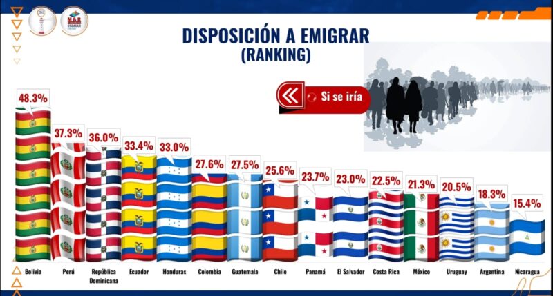 El estudio también abordó el tema de la disposición a emigrar. El 48.3 % de los ciudadanos en países como Bolivia expresó su deseo de abandonar su país, en Nicaragua solo un 15.4 % manifestó esta intención, lo que refleja un fuerte arraigo y confianza en las condiciones nacionales.