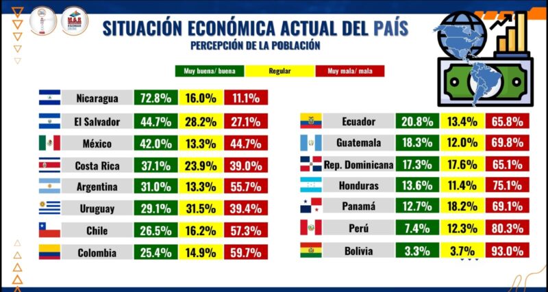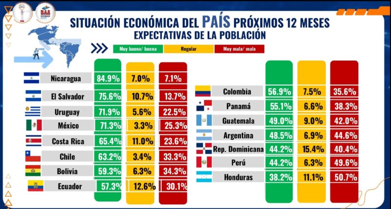 De acuerdo con el licenciado Raúl Obregón, director de M&R Consultores, el 72.8 % de los nicaragüenses considera que la situación económica actual del país es “muy buena”, uno de los porcentajes más altos en la región. Además, cuando se les consultó sobre las expectativas económicas para los próximos 12 meses, el 84.9 % de los nicaragüenses respondió de manera optimista. Mientras que El Salvador se ubicó cerca, con un 75.6 %.