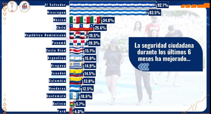 En cuanto a la seguridad ciudadana, el 83.5 % de los encuestados en Nicaragua considera que ha mejorado en los últimos seis meses, lo que coloca al país en el segundo lugar regional, después de El Salvador (92.1 %) y por encima de México (43 %).