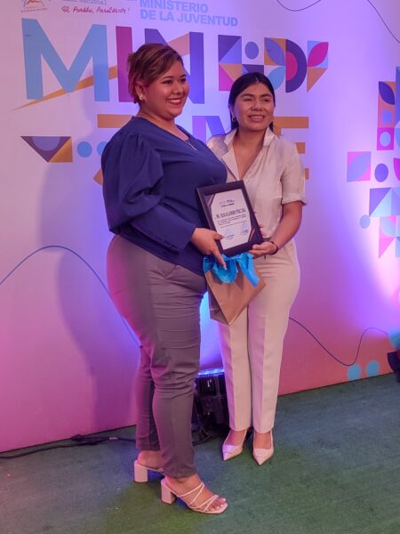 La docente Sara Mora, del área de Bienestar Estudiantil de la Universidad Central de Nicaragua (UCN), expresó su agradecimiento por el reconocimiento recibido, destacando la relación de colaboración entre la universidad y el Ministerio de la Juventud.