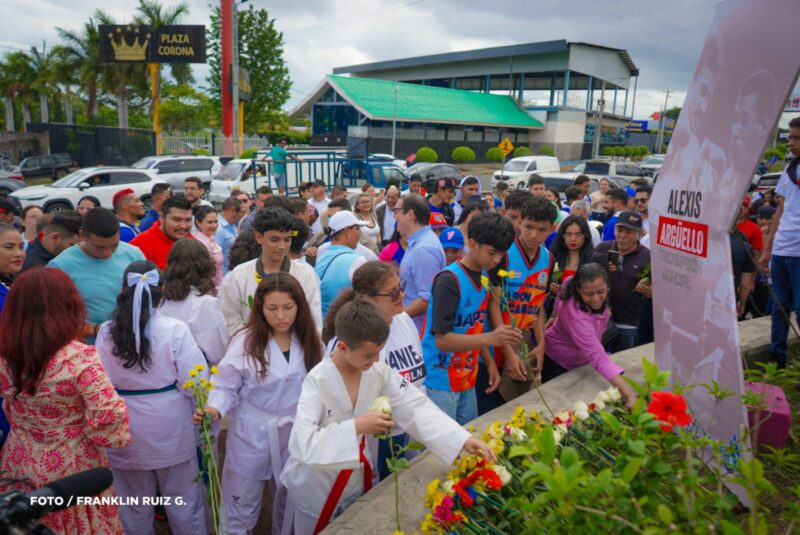 En el marco del 16 aniversario del paso a la inmortalidad del tricampeón mundial de boxeo Alexis Argüello, autoridades nacionales, juventudes deportivas y familiares del tricampeón, se congregaron este martes 1 de julio, en la Plaza de las Victorias para rendir homenaje a su legado deportivo y humano.