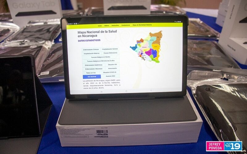 «Luego tenemos también entrega de dispositivos portátiles de pantalla táctil para continuar fortaleciendo nuestro modelo de salud en Bluefield, Bilwi, Las Minas, Río, San Juan, Jinotega, Matagalpa, Boaco, Rivas, Masaya y Managua, así vamos a poder registrar el censo, mantener el registro, facilitar el registro del censo de las mujeres embarazadas, controlar las visitas médicas, es decir, la atención que reciben durante el embarazo y monitorear la información de todos los pacientes, gestionar vacunas, medicamentos, para ayudarnos a proteger la salud de la familia, así estamos», mencionó.