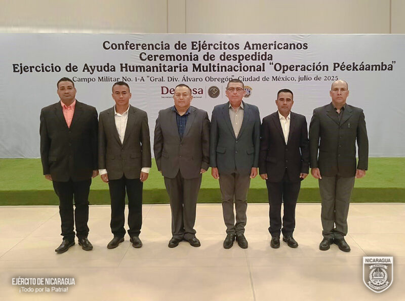 Del 20 al 26 de julio, el Ejército de Nicaragua participó en la fase de ejecución del Ejercicio Multinacional de Ayuda Humanitaria “Operación Péekáamba”, en Santa Lucía, México, junto a delegaciones de más de 20 países. La Unidad Humanitaria y de Rescate “William Ramírez Solórzano” y oficiales del Estado Mayor de la Defensa Civil intervinieron en operaciones simuladas ante un sismo de gran magnitud, intercambiando experiencias y fortaleciendo la cooperación militar regional en respuesta a desastres naturales.