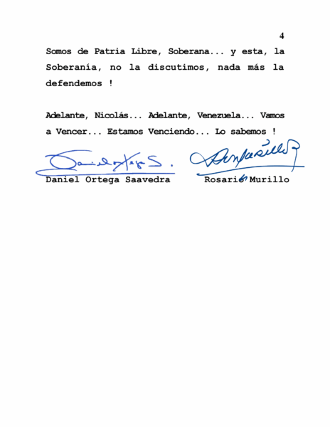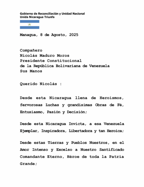 El Copresidente-Comandante Daniel Ortega y la CoPresidenta Compañera Rosario Murillo expresaron su firme respaldo y profunda solidaridad al querido compañero Nicolás Maduro Moros, Presidente Constitucional de la República Bolivariana de Venezuela, reiterando los lazos históricos de hermandad y lucha compartida entre ambos pueblos.