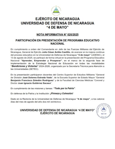 En cumplimiento a orden del Comandante en Jefe de las Fuerzas Militares del Ejército de Nicaragua, General de Ejército Julio César Avilés Castillo, de avanzar en la mejora continua del proceso educativo en la Universidad de Defensa de Nicaragua “4 de mayo” (UDENIC), el 13 de agosto de 2025, se participó de forma virtual en la presentación del Programa Educativo Nacional “Aprender, Emprender y Prosperar”, en el marco de la segunda fase de implementación de la Estrategia Nacional de Educación en todas las modalidades “Bendiciones y Victorias” 2024-2026, organizado por la Secretaría Técnica para Atención a las Universidades (SETEC).