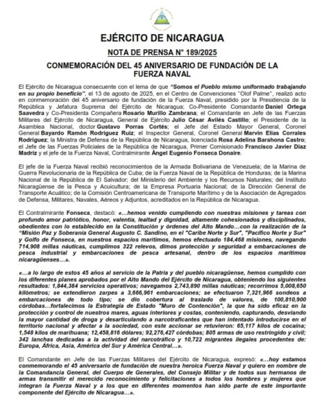 El Ejército de Nicaragua consecuente con el lema de que “Somos el Pueblo mismo uniformado trabajando en su propio beneficio”, el 13 de agosto de 2025, en el Centro de Convenciones ‘‘Olof Palme’’, realizó acto en conmemoración del 45 aniversario de fundación de la Fuerza Naval, presidido por la Presidencia de la República y Jefatura Suprema del Ejército de Nicaragua; Co-Presidente Comandante Daniel Ortega Saavedra y Co-Presidenta Compañera Rosario Murillo Zambrana; el Comandante en Jefe de las Fuerzas Militares del Ejército de Nicaragua, General de Ejército Julio César Avilés Castillo; el Presidente de la Asamblea Nacional, doctor Gustavo Porras Cortés; el Jefe del Estado Mayor General, Coronel General Bayardo Ramón Rodríguez Ruiz; el Inspector General, Coronel General Marvin Elías Corrales Rodríguez; la Ministra de Defensa de la República de Nicaragua, licenciada Rosa Adelina Barahona Castro; el Jefe de las Fuerzas Policiales de la República de Nicaragua, Primer Comisionado Francisco Javier Díaz Madriz y el jefe de la Fuerza Naval, Contralmirante Ángel Eugenio Fonseca Donaire.