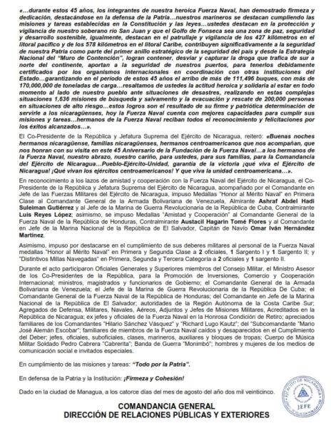 «…durante estos 45 años, los integrantes de nuestra heroica Fuerza Naval, han demostrado firmeza y dedicación, destacándose en la defensa de la Patria…nuestros marineros se destacan cumpliendo las misiones y tareas establecidas en la Constitución y las leyes…ustedes destacan en la protección y vigilancia de nuestro soberano río San Juan y que el Golfo de Fonseca sea una zona de paz, seguridad y desarrollo sostenible, igualmente, destacan en el patrullaje y vigilancia de los 427 kilómetros en el litoral pacífico y de los 578 kilómetros en el litoral Caribe, contribuyen significativamente a la seguridad de nuestra Patria como parte del primer anillo estratégico de la seguridad del país y desde la Estrategia Nacional del “Muro de Contención”, logran contener, desviar y capturar la droga que trafica de sur a norte del continente, aportan a la seguridad de nuestros puertos, para tenerlos debidamente certificados por los organismos internacionales en coordinación con otras instituciones del Estado…garantizando en el período de estos 45 años el arribo de más de 111,496 buques, con más de 170,000,000 de toneladas de carga…resaltamos de ustedes la actitud heroica y solidaria al estar en todo momento al lado de nuestro pueblo ante situaciones de desastres, realizando en estas complejas situaciones 1,636 misiones de búsqueda y salvamento y la evacuación y rescate de 200,000 personas en situaciones de alto riesgo…estos logros son el resultado de su firme y patriótica determinación de servirle a los nicaragüenses, hoy la Fuerza Naval cuenta con mejores capacidades para cumplir sus misiones y tareas…hermanos de la Fuerza Naval reciban todos el reconocimiento y felicitaciones por los éxitos alcanzados…».
