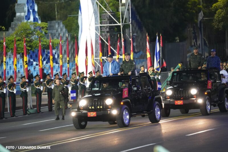 El Co-Presidente de la República de Nicaragua, expresó: «…hermanos nicaragüenses, familias de quienes le sirven al pueblo, le sirven a la Patria, desde las filas del Ejército…esta tarde venimos a ver desfilar a los soldados y oficiales de las diferentes unidades del Ejército y que estarán dando una muestra de lo que es el alto grado de organización, el alto grado de disciplina, el alto grado de amor a la Patria, defendiendo la seguridad para asegurar la paz…cuando marchen en esta avenida de Bolívar a Chávez, allí vendrán marchando también los héroes y los mártires, porque ellos siguen vivos en el corazón del pueblo nicaragüense…¡que viva Nicaragua, que viva el Ejército de Nicaragua!».