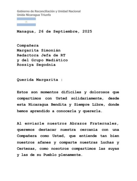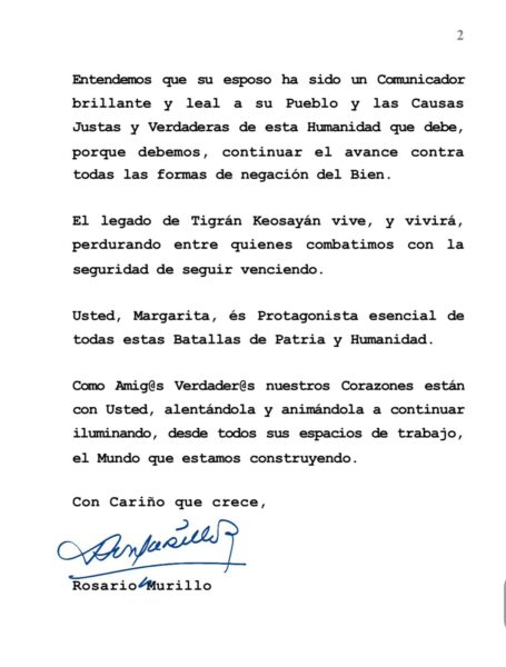 Mensaje de Condolencias y Solidaridad a la Compañera Margarita Simonián, Redactora Jefa de RT y del Grupo Mediático Rossiya Segodnia, ante el fallecimiento de su esposo, el Compañero Comunicador Tigrán Keosayán.