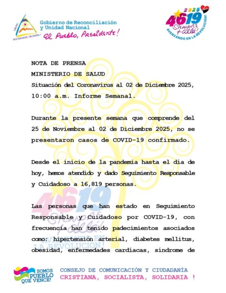 El MINSA reportó que del 02 al 09 de diciembre 2025 no hubo casos ni fallecidos por COVID-19, acumulando 16,819 personas atendidas y 16,574 recuperadas desde el inicio de la pandemia, reforzando su compromiso de prevención y atención.