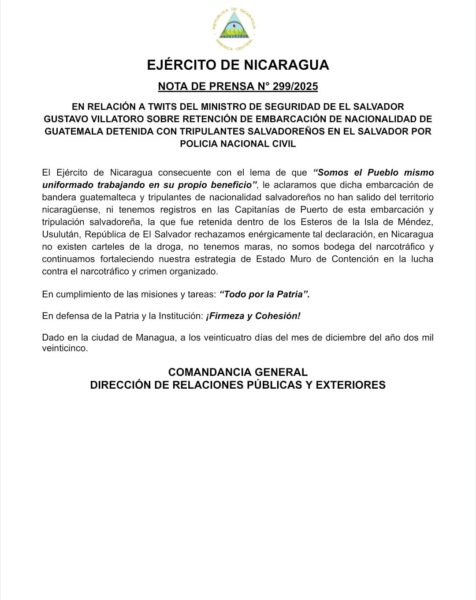 El Ejército de Nicaragua consecuente con el lema de que “Somos el Pueblo mismo uniformado trabajando en su propio beneficio”,le aclaramos que dicha embarcación de bandera guatemalteca y tripulantes de nacionalidad salvadoreños no han salido del territorio nicaragüense, ni tenemos registros en las Capitanías de Puerto de esta embarcación y tripulación salvadoreña, la que fue retenida dentro de los Esteros de la Isla de Méndez, Usulután, República de El Salvador rechazamos enérgicamente tal declaración, en Nicaragua no existen carteles de la droga, no tenemos maras, no somos bodega del narcotráfico y continuamos fortaleciendo nuestra estrategia de Estado Muro de Contención en la lucha contra el narcotráfico y crimen organizado.