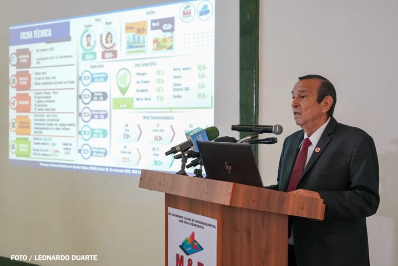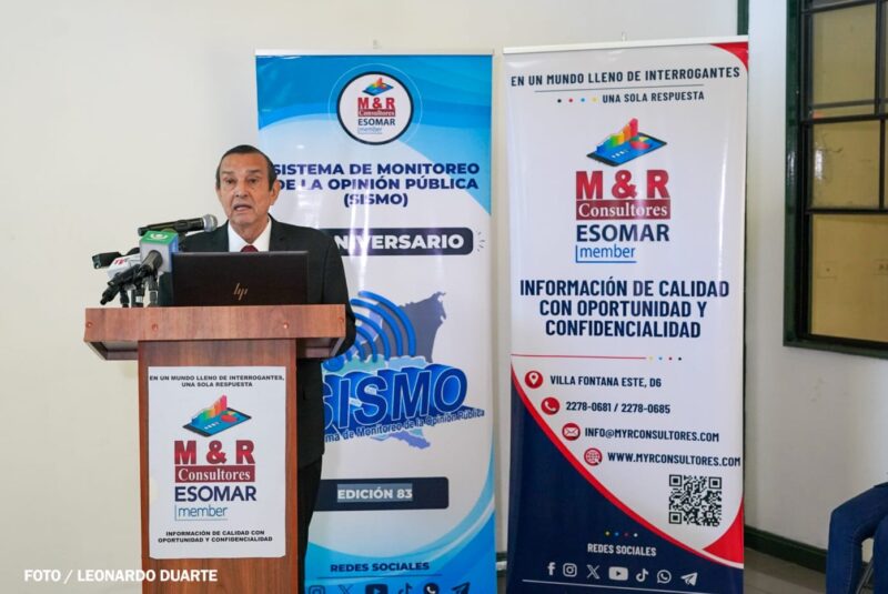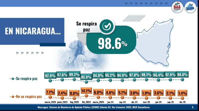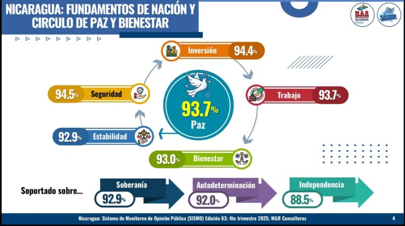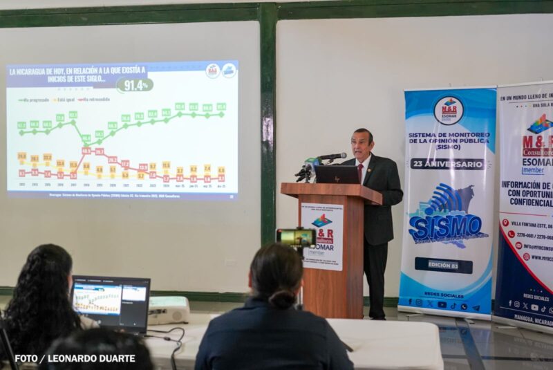 El director general de M&R Consultores, ingeniero Raúl Obregón Morales, presentó los resultados de las personas encuestadas correspondientes al cuarto trimestre de 2025, el que se reflejan que la mayoría de los nicaragüenses valora la paz como un elemento irrenunciable para el desarrollo del país y asocia la estabilidad social, económica y política con mayores oportunidades, seguridad y esperanza en el futuro.