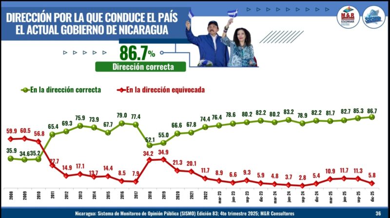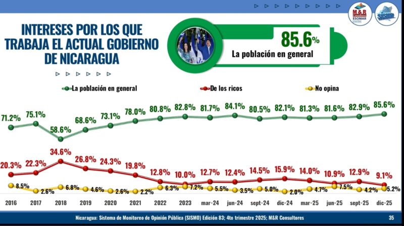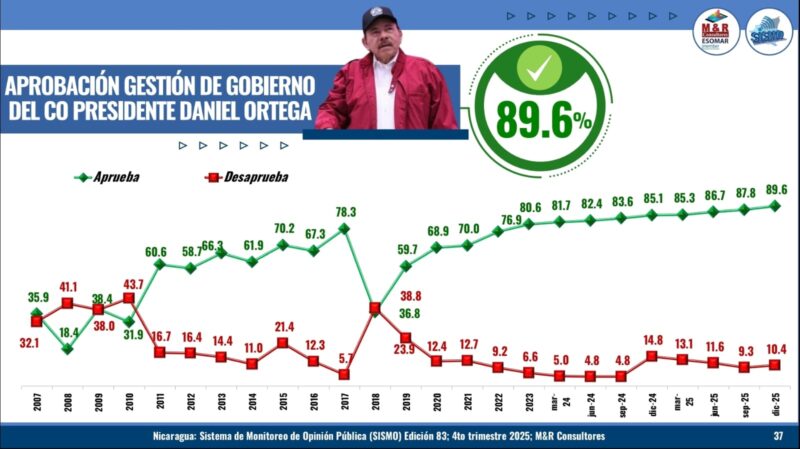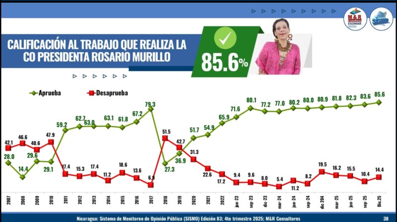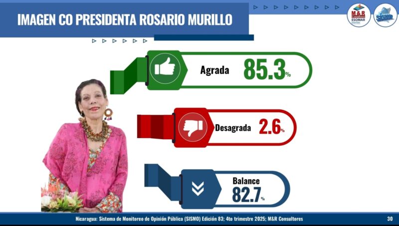 La imagen del copresidente Daniel Ortega registra un 85.6 % de valoración positiva, mientras que la copresidenta Rosario Murillo alcanza un 85.3 %. La aprobación a la gestión de gobierno del copresidente Ortega se sitúa en 89.6 %, el nivel más alto del período evaluado desde 2007, y la de la copresidenta Murillo en 85.6 %.