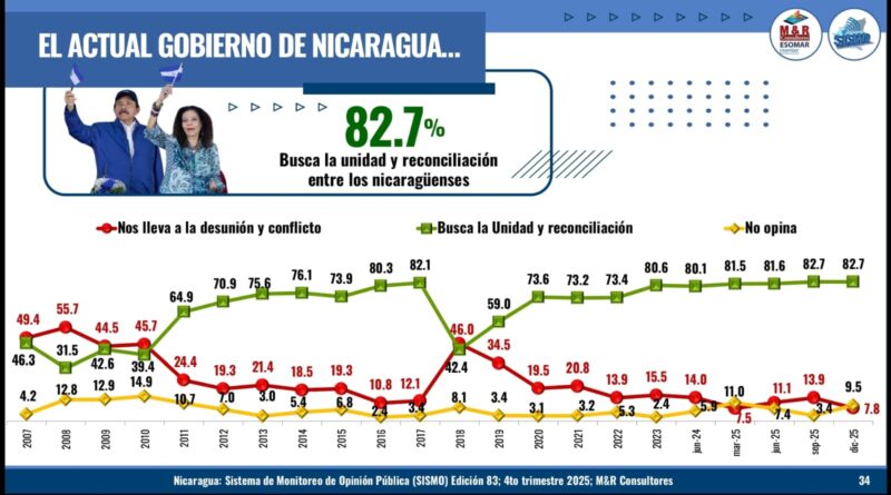 La más reciente edición del Sistema de Monitoreo de la Opinión Pública de M&R Consultores, revela un amplio respaldo ciudadano al clima de paz, estabilidad y bienestar que vive Nicaragua, así como una elevada confianza de la población en la gestión del Gobierno de Reconciliación y Unidad Nacional.
