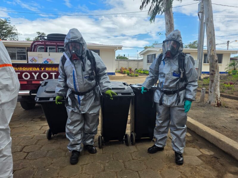Durante el ejercicio se simuló una fuga de gas cloro en un envase pequeño, escenario que podría presentarse en laboratorios, empresas o durante el transporte terrestre, aéreo o marítimo de sustancias químicas. El procedimiento incluyó el control y taponamiento de la fuga, embalaje del material y traslado seguro para su tratamiento en coordinación con instituciones como el MARENA y el MINSA.