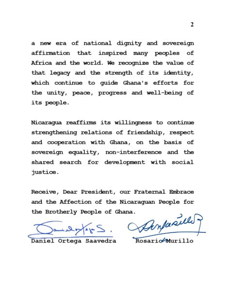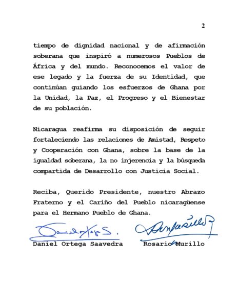 En nombre del Pueblo y Gobierno de Reconciliación y Unidad Nacional de la República de Nicaragua, y en nuestro propio nombre, nos honra hacer llegar a Usted, a su Gobierno y al Pueblo de la República de Ghana, nuestras más cálidas y sinceras felicitaciones al conmemorarse el 69º Aniversario de la Declaración de Independencia, este 6 de Marzo.