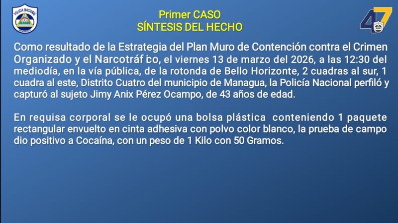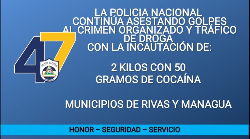 La Policía Nacional continúa asestando golpes al crimen organizado y al narcotráfico con la incautación de 2 kilos con 50 gramos de cocaína en dos operativos realizados en los municipios de Managua y Rivas, como parte de la estrategia del Plan Muro de Contención.