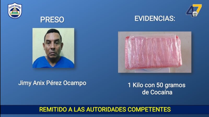 Según el reporte policial, en la vía pública, de la rotonda de Bello Horizonte dos cuadras al sur y una al este, agentes policiales perfilaron y capturaron al ciudadano Jimmy Anix Pérez Ocampo, de 43 años. Durante la requisa corporal se le ocupó una bolsa plástica que contenía un paquete rectangular envuelto en cinta adhesiva con polvo color blanco.