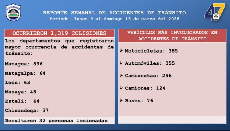 Durante la semana evaluada se contabilizaron un total de 1,319 colisiones. Los departamentos con mayor incidencia fueron: Managua con 896 casos, seguido de Matagalpa (64), León (63), Masaya (48), Estelí (44) y Chinandega (37). Como resultado, se reportaron 32 personas lesionadas.