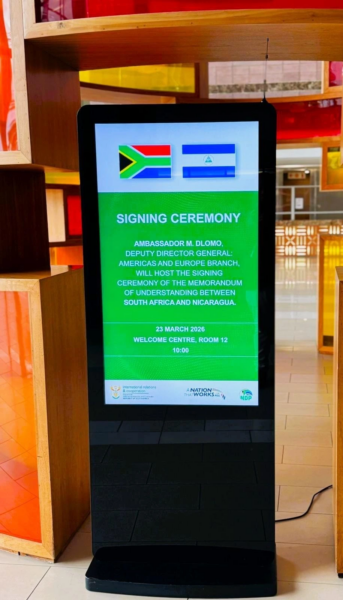 Este 23 de Marzo 2026, en representación de nuestro Gobierno de Reconciliación y Unidad Nacional y de nuestros Copresidentes, el Comandante Daniel Ortega Saavedra y la Compañera Rosario Murillo, nuestra Misión Diplomática en Sudáfrica suscribió el Memorando de Entendimiento sobre Consultas Políticas a Nivel de Altos Funcionarios entre la República de Nicaragua y la República de Sudáfrica.